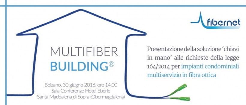 La soluzione ‘chiavi in mano’ alle richieste della legge 164/2014 per gli impianti condominiali multiservizio in fibra ottica si chiama Multifiber Building, ed è stata studiata, sviluppata e prodotta da Fibernet. Il 30 giugno dalle ore 14.00, Multifiber Building verrà presentato a Bolzano, presso la sala conferenze dell’Hotel Eberle, Santa