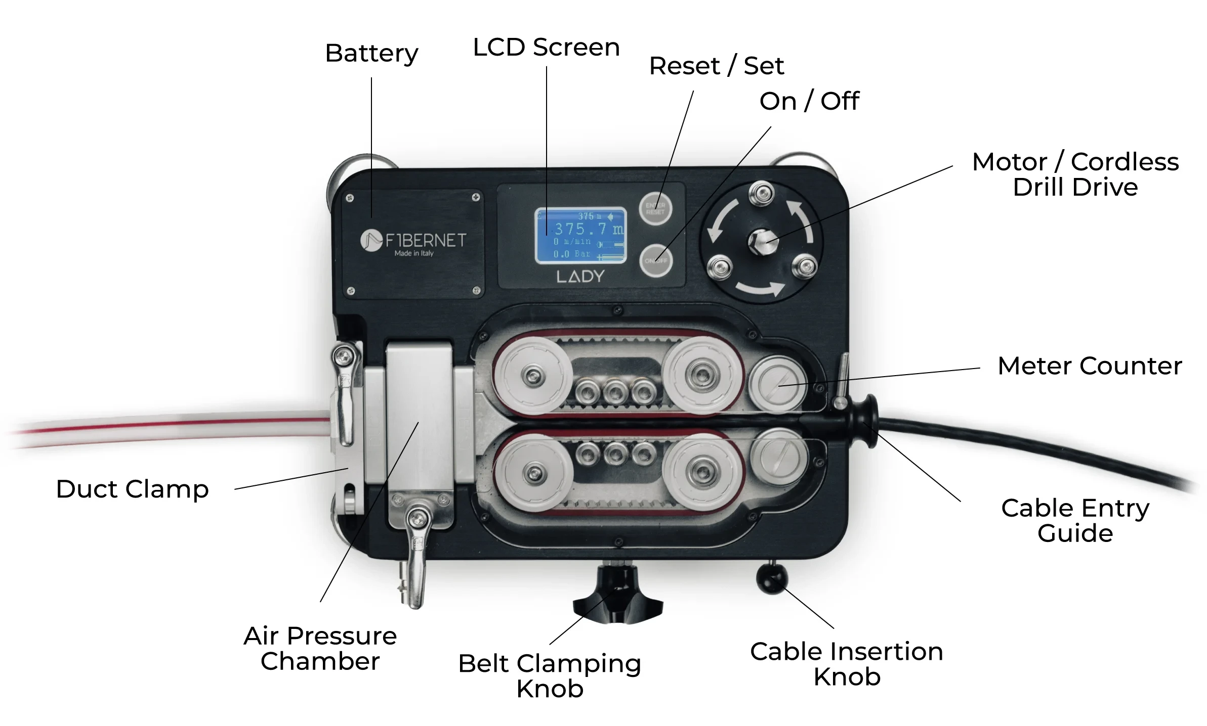 Lady uses belt drive technology instead of wheels, ensuring stable cable grip and reliable installation over long distances. The electronic control system protects the cable by preventing excessive torque during installation.