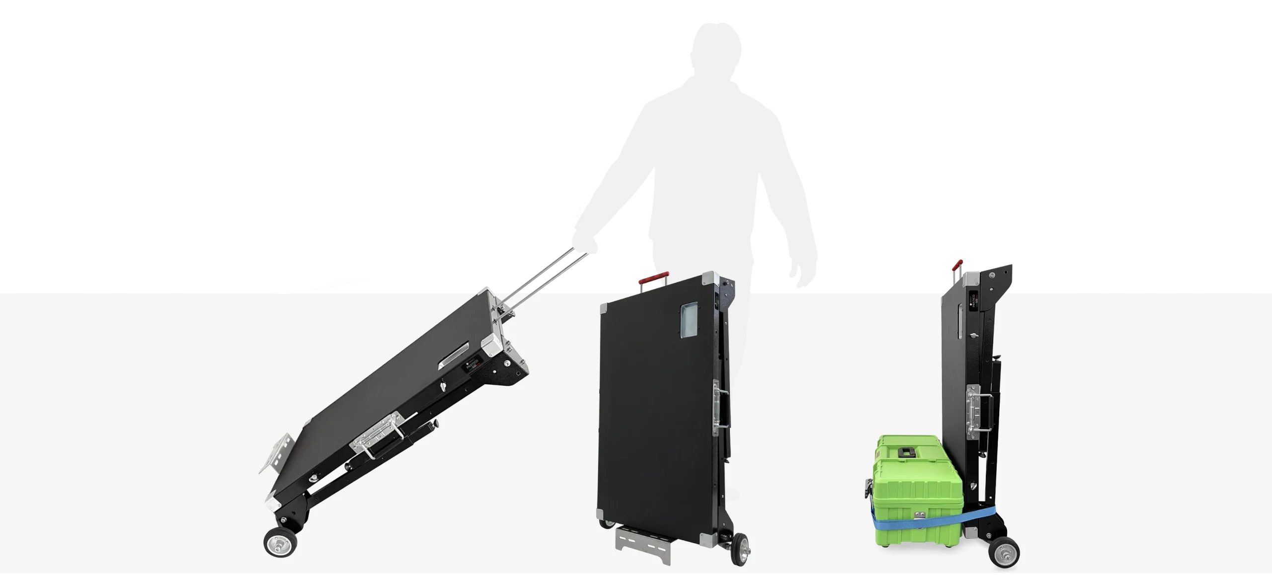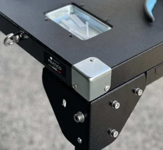 Grazie al kit trolley opzionale e alla struttura pieghevole, Pratico può essere rapidamente trasformato in un supporto compatto e portatile, ottimizzando tempi e spazio durante il trasporto.