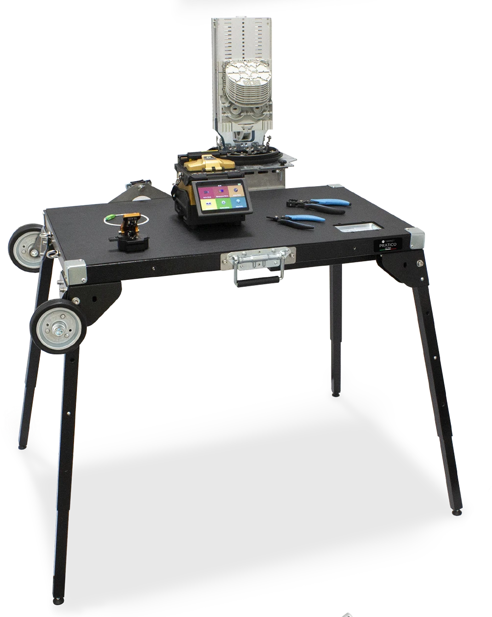 PRATICO è il banco da lavoro professionale progettato da Fibernet per offrire una postazione stabile, regolabile e facilmente trasportabile per operazioni di giunzione della fibra in campo. Dotato di tre altezze regolabili, un piano di lavoro in ABS, vassoio porta giunti e supporti dedicati per muffole e ombrello, è progettato per garantire massimo comfort e funzionalità in qualsiasi ambiente di lavoro.