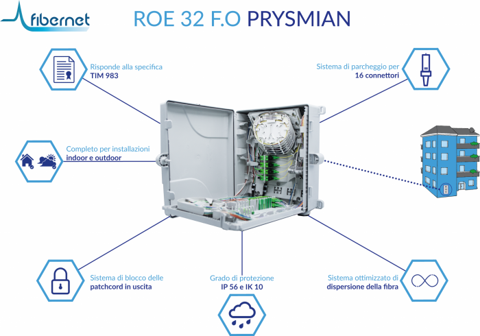 Compatto, resistente, adatto sia per applicazioni indoor che outdoor. Il Ripartitore Ottico di Edificio da 32 fibre ottiche della Prysmian risponde alla normativa TIM 983 ed è adatto alla architettura di rete Flash Fiber.